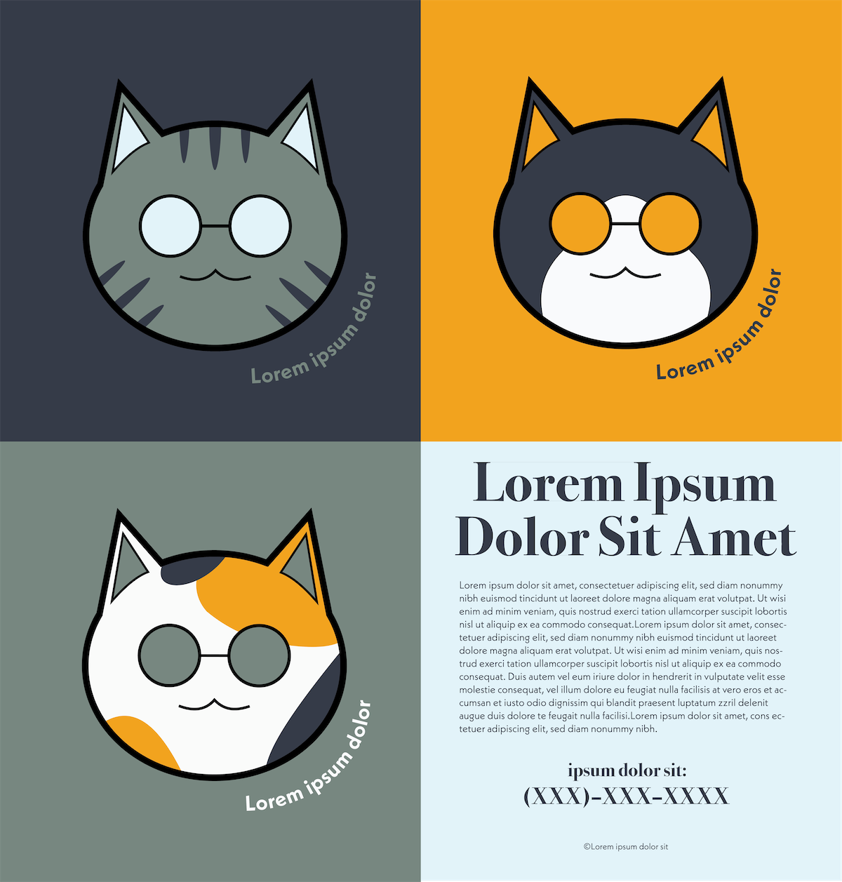 Initially, this was a typography project where I was tasked to design bus advertisements for either a fictional business or an existing one that was rebranding. This project was also an exercise in using the pen tool in Adobe Illustrator, as well as creating works partially in Illustrator and partially in Indesign. The hypothetical company that I ended up creating ads for is very loosely based off a real sanctuary (not a cat café), visually however, it ended up being inspired more by things like Dick Bruna’s Miffy and the Tama themed decor at Kishi Station.